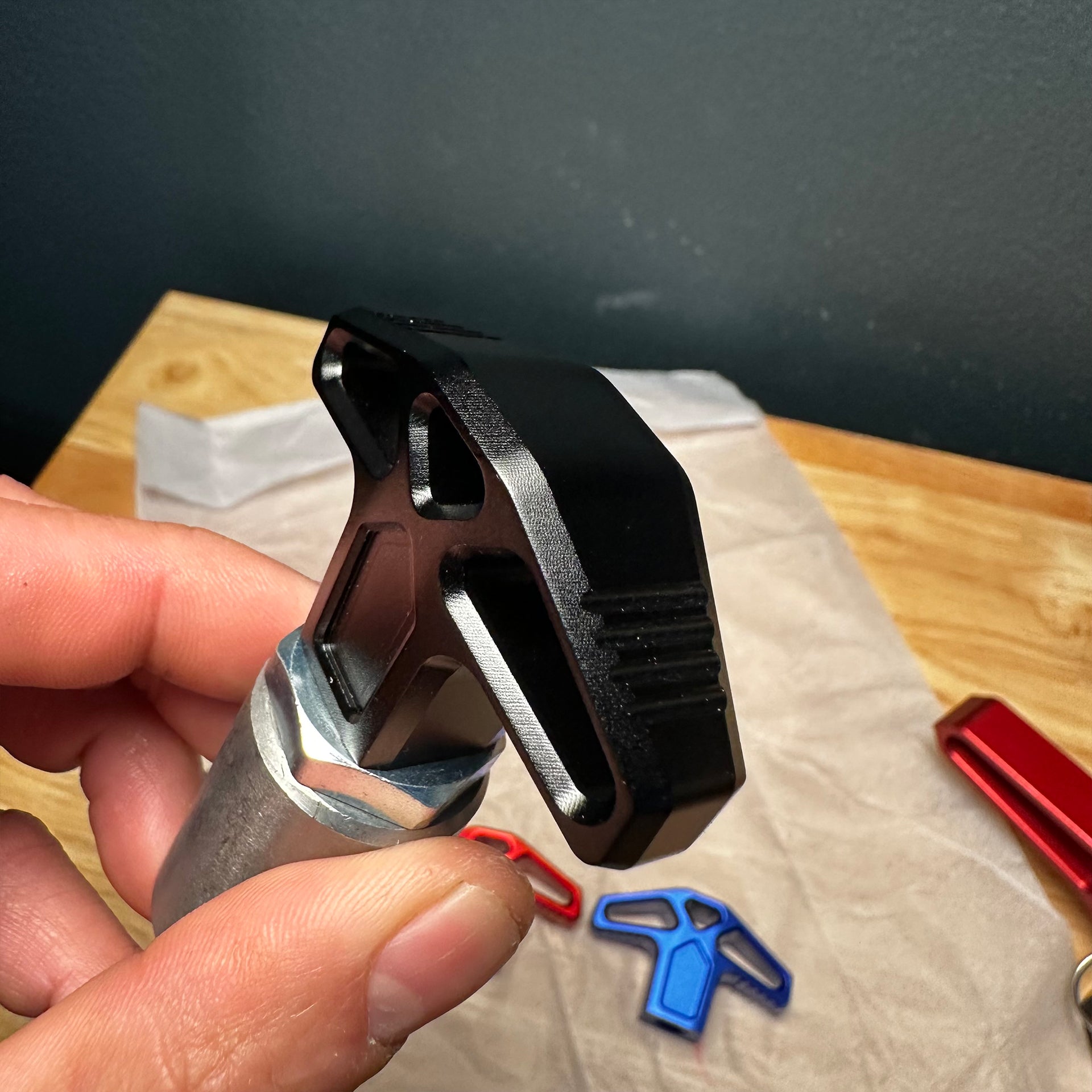 Handle Comes in Anodize Red, Black, and Blue. As well as RAW Aluminum (Grey)
